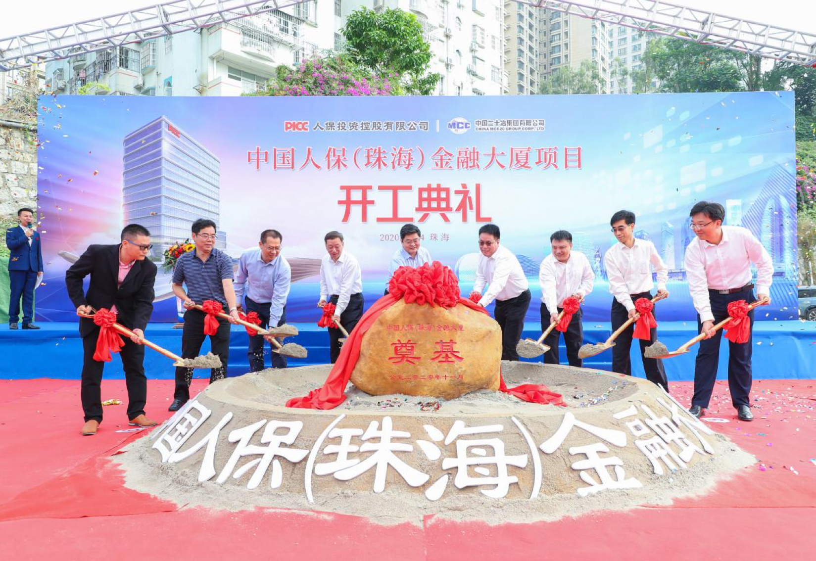 2020年11月24日,中国人保(珠海)金融大厦项目开工建设,人保投控在广东珠海项目现场举办简单而隆重的开工典礼。公司党委书记、总裁董清秀,党委委员高翔,中国二十冶集团有限公司董事长樊金田等领导嘉宾出席开工典礼,公司建设管理部、广州专员办、人保产健寿驻粤机构、广东华工监理、广东中京国际设计院等有关同志参加典礼。
